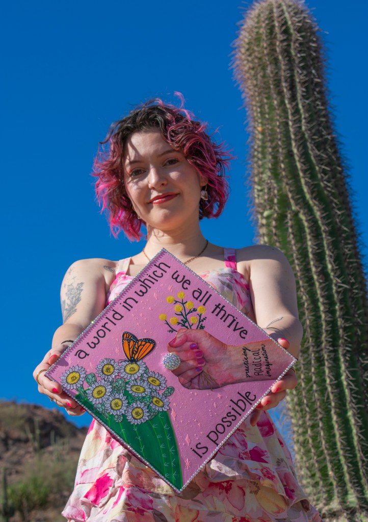These are the questions I hope to inspire with my cap and ongoing projects. I challenge you, as myself, to practice radical imagination, and remember that radical change is possible. Humans did not always live under these structures, and every step we have made to form the world we have today was thought to be impossible before it was done. The impossible is possible – we just have to imagine it and enact it.